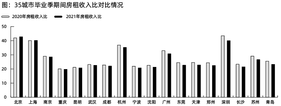 《報(bào)告》表示,一線及新一線城市仍是畢業(yè)青年的首選就業(yè)城市,但這些城市租房壓力不盡相同,北京、上海、深圳、杭州、珠海及廣州處于“壓力區(qū)間”,房租收入比不低于30%,長(zhǎng)沙在新一線城市中租賃負(fù)擔(dān)最低。