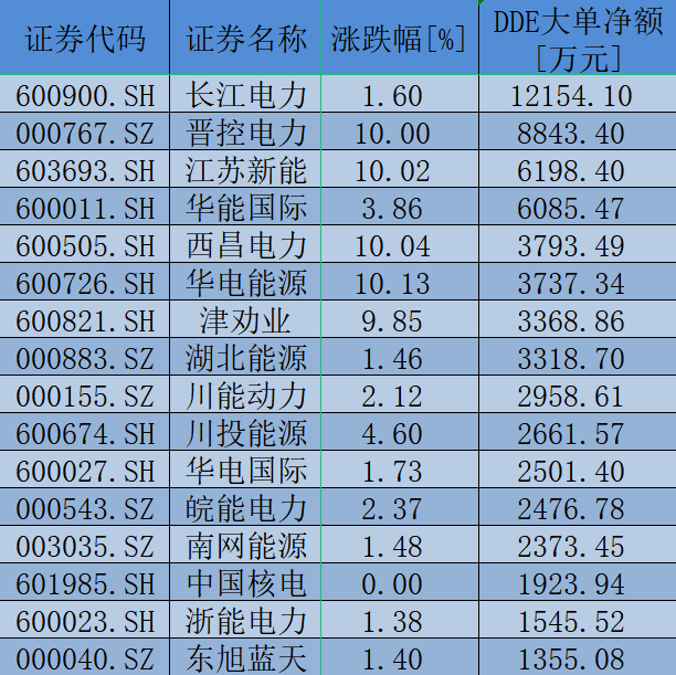 電力板塊的上漲也吸引了資金的追捧。同花順數(shù)據(jù)顯示,今日共有38只個股受到大單資金青睞。其中,長江電力的大單資金凈流入額達到12154.10萬元;另外,包括晉控電力(8843.40萬元)、江蘇新能(6198.40萬元)、華能國際(6085.47萬元)、西昌電力(3793.49萬元)、華電能源(3737.34萬元)等在內的15只個股的大單資金凈流入額也超過1000萬元。