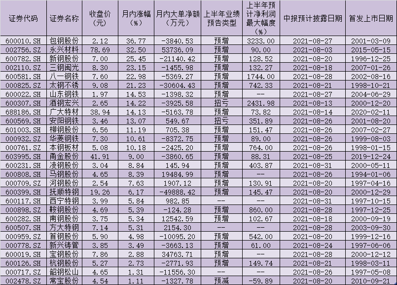 表:月內(nèi)股價實現(xiàn)上漲的鋼鐵股一覽