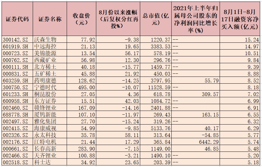 表:8月1日-8月17日融資客凈買(mǎi)入額超5億元股一覽