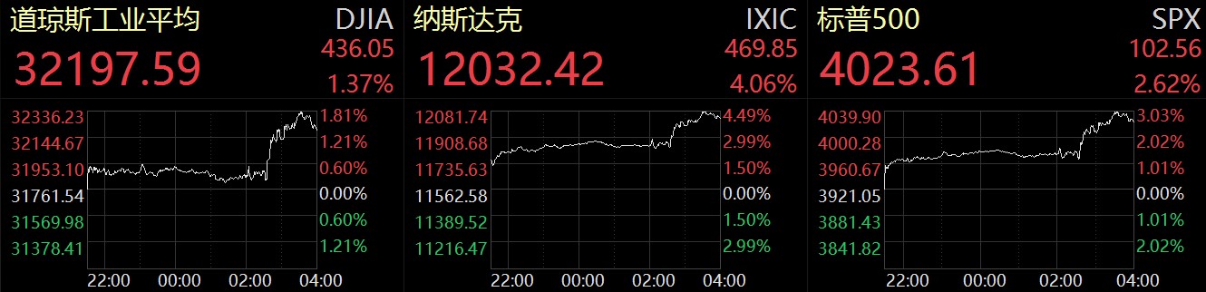市場(chǎng)分析人士普遍認(rèn)為本次加息符合市場(chǎng)預(yù)期。受到消息面影響,當(dāng)?shù)貢r(shí)間7月27日,美股三大指數(shù)集體收漲,其中,道瓊斯指數(shù)漲1.37%,報(bào)32197.59點(diǎn);標(biāo)普500指數(shù)漲2.62%,報(bào)4023.61點(diǎn);納斯達(dá)克指數(shù)漲4.06%,報(bào)12032.42點(diǎn),創(chuàng)2020年4月份以來(lái)最大單日漲幅。
