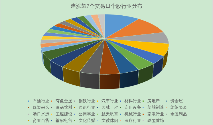 從行業(yè)角度來看,超過7個交易日連續(xù)上漲股涉及27類行業(yè),其中,石油行業(yè)、有色金屬行業(yè)均為5只,鋼鐵行業(yè)與汽車行業(yè)均為3只,貴金屬、煤炭采選、食品飲料、通訊行業(yè)、園林工程、專用設(shè)備等行業(yè)均為2只。