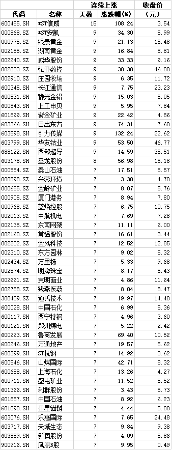 《證券日報》記者通過同花順數(shù)據(jù)統(tǒng)計發(fā)現(xiàn),截至周一,滬深兩市共有47只個股達到或超過連續(xù)7個交易日上漲,連漲天數(shù)在9天以上的個股分別為:*ST信威(15天)、引力傳媒(9天)、日出東方(9天)、華友鈷業(yè)(9天)、弘亞數(shù)控(9天)、*ST安凱(9天)、威華股份(9天)、紫金礦業(yè)(9天)、銀泰黃金(9天)、湖南黃金(9天)、豫光金鉛(9天)、西部超導(dǎo)(9天)、長江通信(9天)、莊園牧場(9天)、上工申貝(9天)。