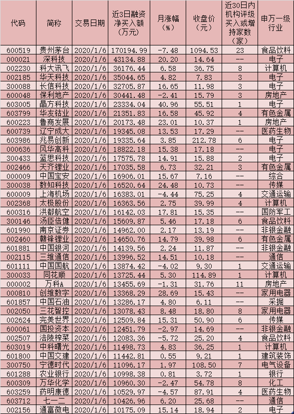 《證券日報》記者根據(jù)同花順數(shù)據(jù)統(tǒng)計發(fā)現(xiàn),1月2日至1月6日的3個交易日里,滬深兩市共有1077只兩融標(biāo)的股實現(xiàn)融資凈買入,其中累計融資凈買入額超1億元的兩融標(biāo)的股達(dá)到41只,貴州茅臺(17.02億元)、深科技(4.31億元)、科大訊飛(3.62億元)、華天科技(3.50億元)、長信科技(3.27億元)、保利地產(chǎn)(3.04億元)、晶方科技(2.33億元)、華友鈷業(yè)(2.14億元)和魯商發(fā)展(2.02億元)等9只個股期間累計融資凈買入額均達(dá)到2億元以上。另外,包括遼寧成大、兆易創(chuàng)新、風(fēng)華高科、藍(lán)思科技、天齊鋰業(yè)、中國寶安等在內(nèi)的32只個股期間累計融資凈買入額均達(dá)到或超過1億元,上述41只個股合計融資凈買入額達(dá)到86.53億元。