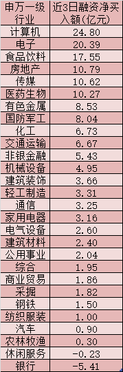 行業(yè)特征方面,在1月2日至1月6日期間,26個申萬一級行業(yè)期間實現(xiàn)融資凈買入,其中,計算機、電子、食品飲料、房地產(chǎn)、傳媒、醫(yī)藥生物等六行業(yè)期間融資凈買入額居前,均超10億元,分別為:24.80億元、20.39億元、17.55億元、10.79億元、10.62億元和10.27億元。