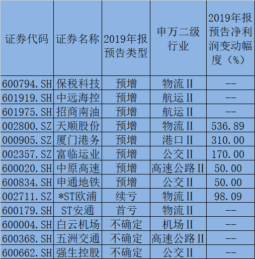 事實上,受到春節(jié)效應的影響,交通運輸產(chǎn)業(yè)相關(guān)公司的業(yè)績正在改善。從已披露年報預告的13家公司來看,共有8家公司2019年業(yè)績表現(xiàn)預喜。報告期內(nèi),天順股份(536.89%)、廈門港務(310.00%)、富臨運業(yè)(170.00%)等3家公司預計凈利潤實現(xiàn)同比翻番。*ST歐浦(98.09%)、中原高速(50.00%)、申通地鐵(50.00%)等3家公司年報凈利潤有望實現(xiàn)同比增長50%及以上。