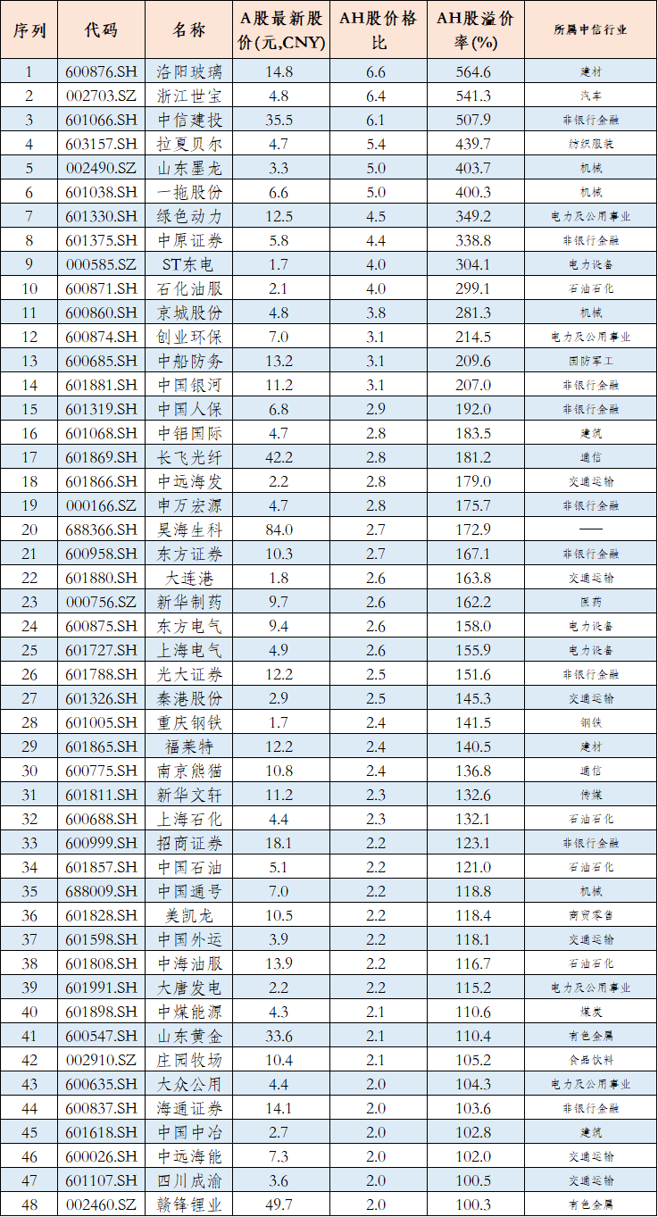 從AH股溢價(jià)率超過100%的全部個(gè)股來看,洛陽玻璃、浙江世寶、中信建投、拉夏貝爾、山東墨龍這5只個(gè)股溢價(jià)率位列前五。詳見下表: