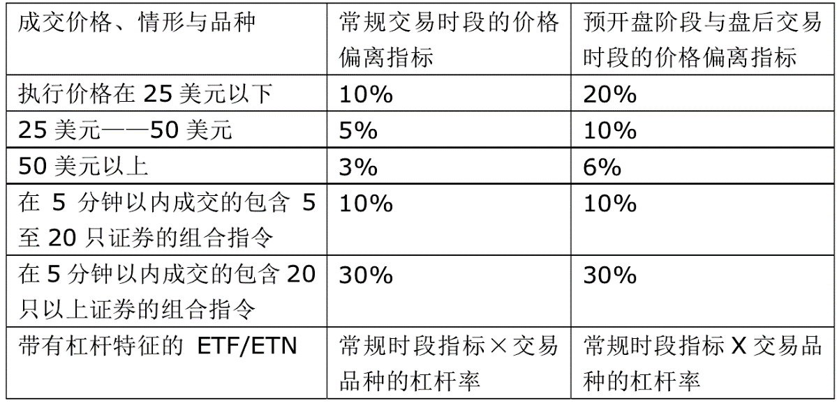 以美國(guó)為例,2010年7月,F(xiàn)INRA、紐交所、納斯達(dá)克交易所、芝加哥股票交易所等,向美國(guó)證監(jiān)會(huì)提出修改錯(cuò)誤認(rèn)定和取消交易的申請(qǐng),在同年9月得到批準(zhǔn)。標(biāo)準(zhǔn)分交易所上市股票和場(chǎng)外市場(chǎng)股票。明顯執(zhí)行錯(cuò)誤的異常交易的認(rèn)定標(biāo)準(zhǔn),通常有數(shù)值準(zhǔn)則和附加因素。數(shù)值準(zhǔn)則(見(jiàn)下圖),當(dāng)買(mǎi)入價(jià)格存在高于或賣(mài)出價(jià)格存在低于參考價(jià)格一定幅度的交易。附加因素是指雖然交易價(jià)格高于或低于參考價(jià)格,但交易所需要參考其他因素。譬如,相關(guān)證券新聞、相關(guān)證券衍生品交易情況等。
