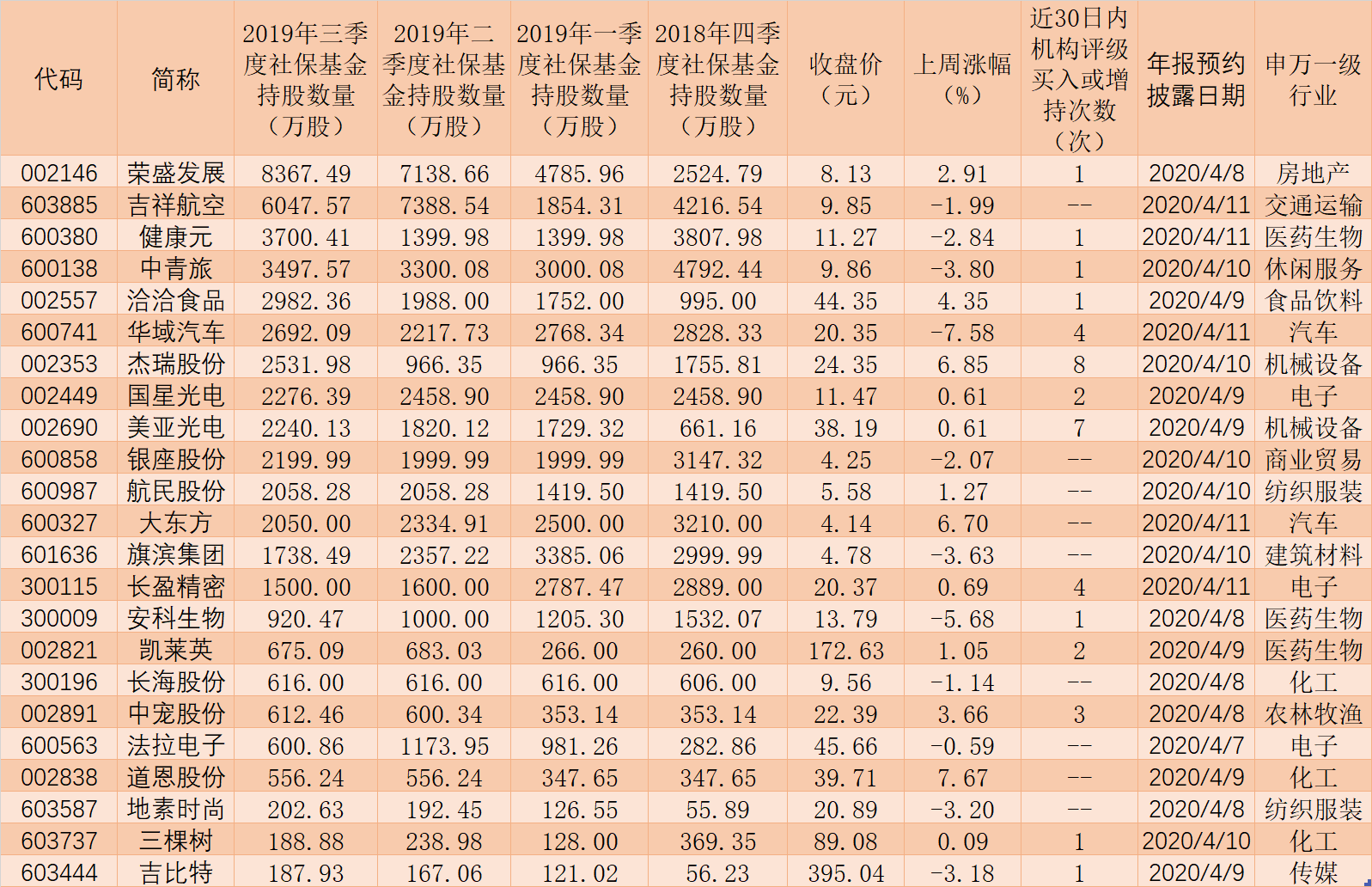 值得一提的是,上述223只個(gè)股除獲市場(chǎng)資金的青睞外,也受到社?;鸬那嗖A。統(tǒng)計(jì)顯示,截至2019年三季度末,有23只個(gè)股獲得社?;疬B續(xù)4個(gè)季度持倉,榮盛發(fā)展、吉祥航空、健康元、中青旅、洽洽食品、華域汽車、杰瑞股份、國(guó)星光電、美亞光電、銀座股份、航民股份、大東方、旗濱集團(tuán)、長(zhǎng)盈精密等個(gè)股去年三季度社保基金持股數(shù)量均超過1000萬股。