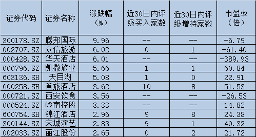 進(jìn)一步梳理發(fā)現(xiàn),部分旅游餐飲股近30日內(nèi)均受到天風(fēng)證券、東北證券等多家機(jī)構(gòu)看高一線。其中,中國(guó)國(guó)旅、首旅酒店、錦江酒店、中青旅、宋城演藝、峨眉山A等6只個(gè)股期間均受到券商10次及以上給予“買入”或“增持”等看好評(píng)級(jí),后市表現(xiàn)值得密切跟蹤。