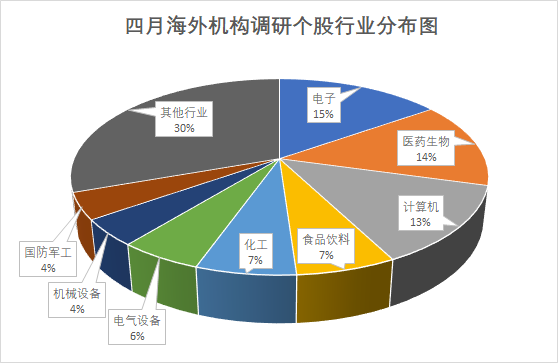 行業(yè)方面,上述被海外機構調研的92只個股主要扎堆在電子、醫(yī)藥生物、計算機、食品飲料、化工等五大行業(yè),涉及個股數(shù)量分別為14只、13只、12只、6只和6只。