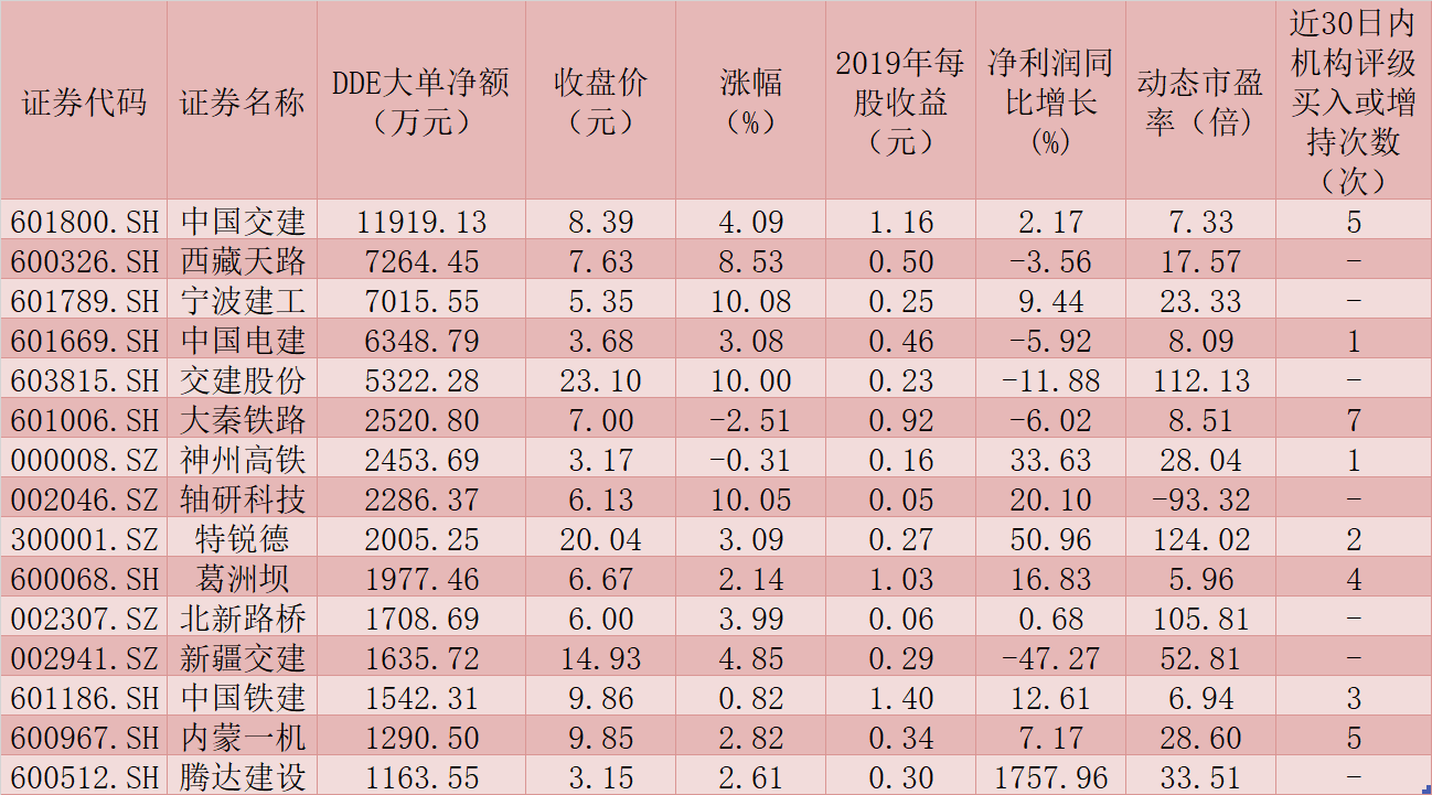 進(jìn)一步統(tǒng)計(jì)發(fā)現(xiàn),上述被大單資金追捧的37只個(gè)股中,有16只個(gè)股近30日內(nèi)獲得機(jī)構(gòu)給予“買入”或“增持”等看好評(píng)級(jí)。其中,大秦鐵路、隧道股份、中國交建、內(nèi)蒙一機(jī)、葛洲壩、七一二、中國鐵建和安徽建工等8只個(gè)股近期均受到3家以上機(jī)構(gòu)扎堆推薦,后市表現(xiàn)值得關(guān)注。