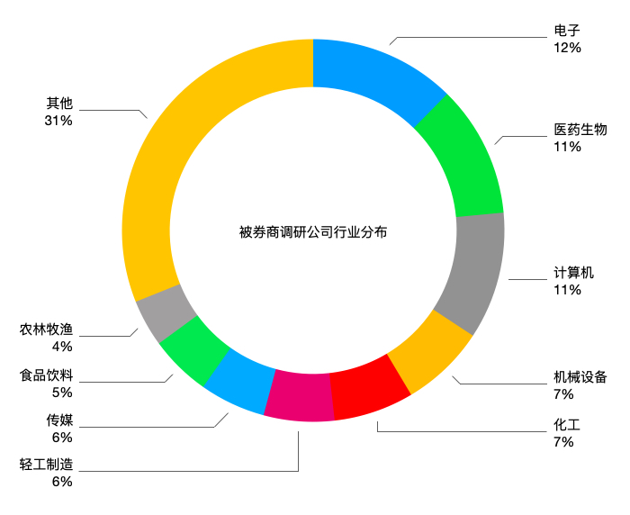 從行業(yè)分布來看,被券商調(diào)研的上市公司主要集中在電子、醫(yī)藥生物、計(jì)算機(jī)等熱門行業(yè),76.49%的公司來自“中小創(chuàng)”。