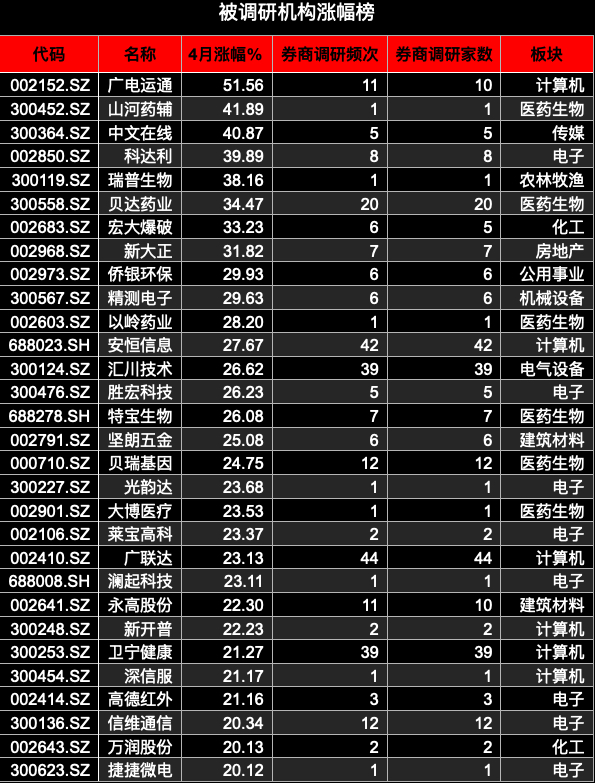在被券商調(diào)研的251家上市公司中,今年4月份,股價(jià)漲幅超過20%的有30家,股價(jià)漲幅超過30%的有8家,股價(jià)漲幅超過50%的有1家上市公司。其中,廣電運(yùn)通漲幅最高為51.56%。同時(shí),漲幅超過40%的還有山河藥輔、中文在線,漲幅分別為41.89%、40.87%。