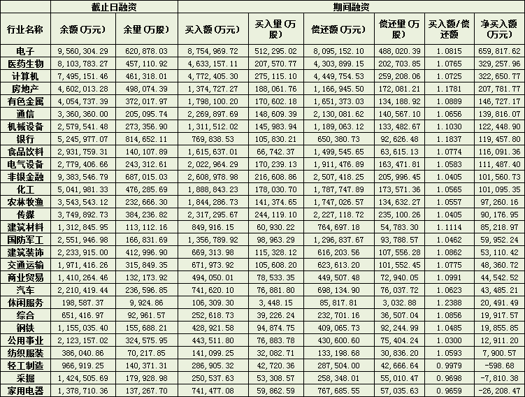 另外,房地產(chǎn)、有色金屬、通信和機械設(shè)備等行業(yè)融資凈買入額也均在12億元以上。僅有輕工制造、采掘和家用電器等三行業(yè)被融資客減持。