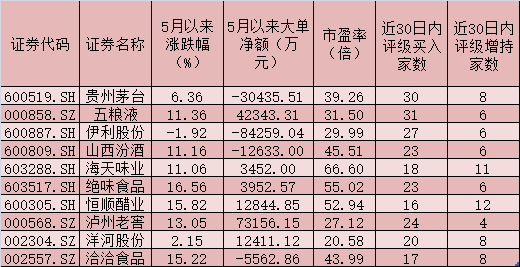 此外,通過梳理包括光大證券、東莞證券等在內(nèi)的多家券商研報發(fā)現(xiàn),食品飲料行業(yè)內(nèi),貴州茅臺、五糧液、伊利股份、山西汾酒、海天味業(yè)、絕味食品、恒順醋業(yè)、瀘州老窖、洋河股份、洽洽食品等10只成份股近30日內(nèi)均受到機構(gòu)25次及以上給予“買入”或“增持”等看好評級,后市表現(xiàn)值得關(guān)注。