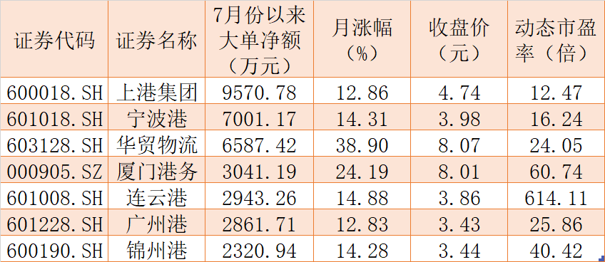 資金流向上,7月份以來,板塊內(nèi)共有13只概念股呈現(xiàn)大單資金凈流入態(tài)勢,上港集團期間累計大單資金凈流入居首,達到9570.78萬元,寧波港(7001.17萬元)、華貿(mào)物流(6587.42萬元)、廈門港務(wù)(3041.19萬元)、連云港(2943.26萬元)、廣州港(2861.71萬元)和錦州港(2320.94萬元)等6只概念股當(dāng)日均受到2000萬元以上大單資金追捧,這7只概念股合計吸金3.43億元。