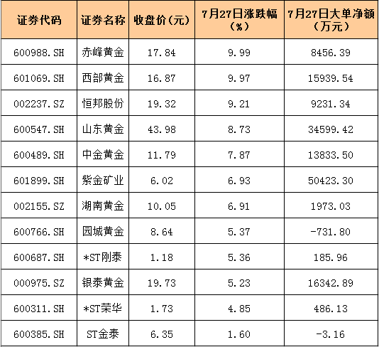 可以看到,一路走高的金價也帶動了黃金股的大面積活躍。對于做多黃金股的資金來說,目前市場中的相關(guān)概念股相對于黃金資產(chǎn)本身來說,有低位補漲的需求。在7月27日國際金價創(chuàng)出歷史新高之際,15.07億元大單涌入黃金板塊,資金的大幅流入助力12只黃金股全線走強,截至收盤漲幅均在1%以上,赤峰黃金、西部黃金、*ST剛泰、*ST榮華等4只個股強勢漲停。