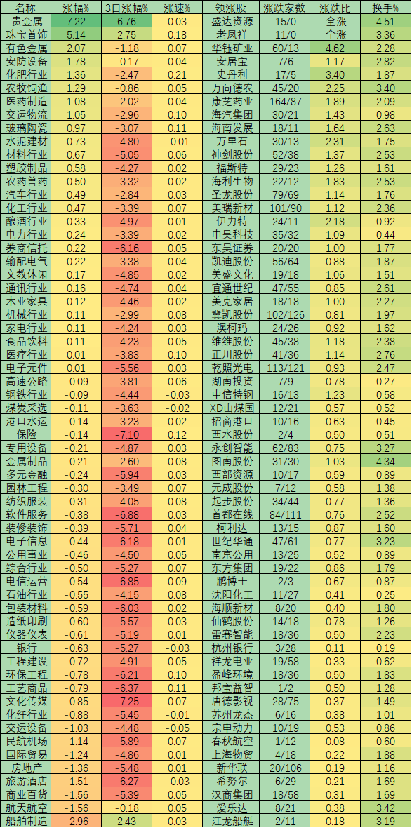 表:周一各行業(yè)市場表現(xiàn)一覽