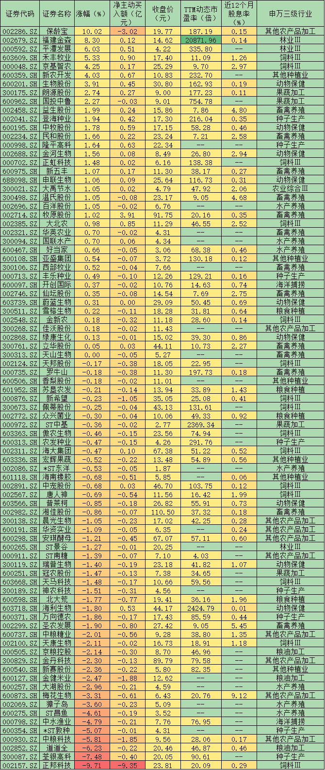 表:周一農(nóng)林牧漁股市場表現(xiàn)一覽