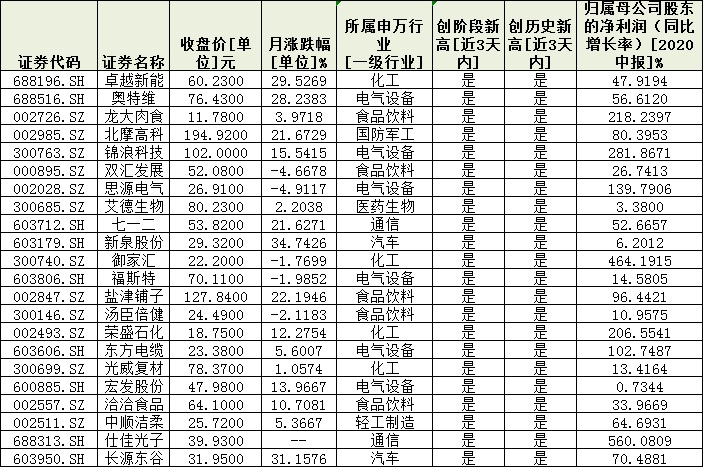 表:22只股價創(chuàng)出歷史新高的業(yè)績增長股情況