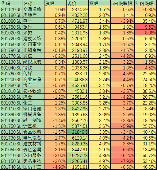 表:周三申萬(wàn)一級(jí)行業(yè)市場(chǎng)表現(xiàn)一覽