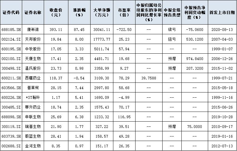 表:8月13日大單資金凈流入疫苗股一覽