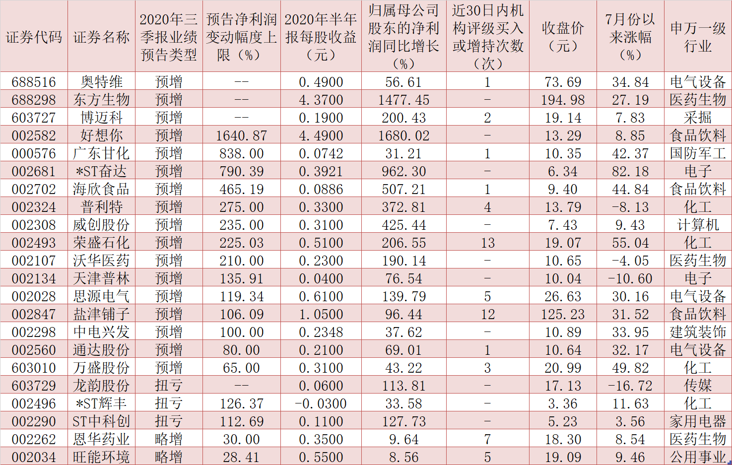 表:2020年三季報(bào)業(yè)績(jī)預(yù)喜股一覽