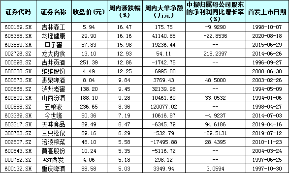 具體來看,本周以來,46只食品飲料股逆市上漲,其中,吉林森工、均瑤健康、口子窖、龍大肉食、古井貢酒、維維股份等6只個股期間累計漲幅超10%。