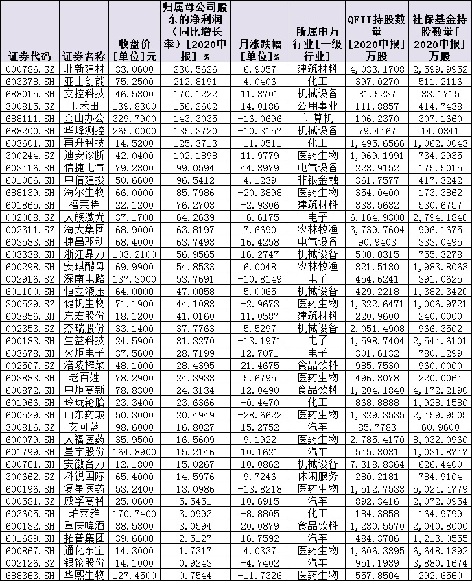 秉承長期投資、價值投資理念的社?;鸪謧}一直以來備受各方關(guān)注。在上述1110家凈利潤增長的公司中,截至今年上半年,包括順絡(luò)電子、湯臣倍健、利爾化學(xué)、廈門象嶼等在內(nèi)的197家公司的前十大流通股股東名單中有社保基金現(xiàn)身。另外,有106公司的前十大流通股股東名單中有QFII現(xiàn)身。進(jìn)一步梳理發(fā)現(xiàn),有43家公司同時被社保基金和QFII持有,成為兩大機(jī)構(gòu)共同追捧的對象。