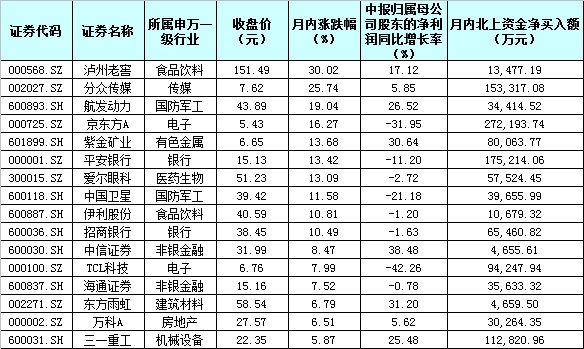 表:月內(nèi)漲幅超5%的北上資金凈買入活躍股一覽