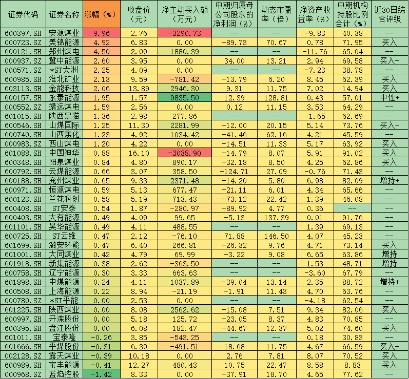 表:周四煤炭采選板塊市場表現(xiàn)一覽