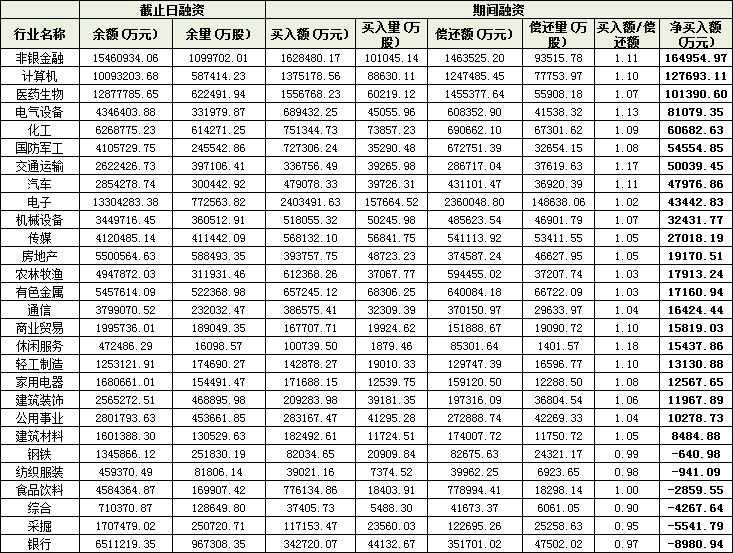 表:9月份以來申萬一級28個行業(yè)融資情況:
