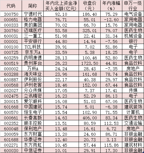 表:今年以來北上資金凈買入額超過10億元的個股