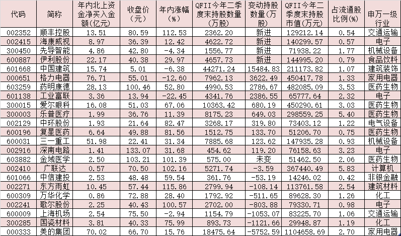 表:今年二季度獲QFII持倉且今年以來受北上資金青睞的個股
