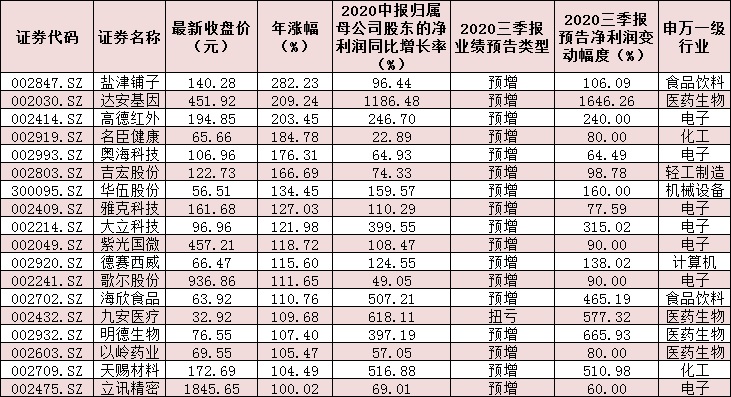 眾所周知,業(yè)績是上市公司的“試金石”,股價最終由公司業(yè)績優(yōu)劣來左右。統(tǒng)計發(fā)現(xiàn),今年以來,在市場震蕩攀升中,上證指數(shù)累計漲幅為7.5%。在上述154只雙增長股中,有98只個股跑贏同期上證指數(shù),占比63.6%。其中,包括鹽津鋪子、達安基因、高德紅外、名臣健康、奧??萍嫉仍趦?nèi)的18只個股,年內(nèi)累計漲幅均超100%,盡顯強勢。