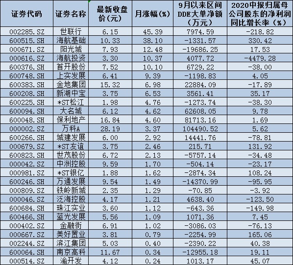 表:9月份以來(lái)實(shí)現(xiàn)上漲的地產(chǎn)股一覽