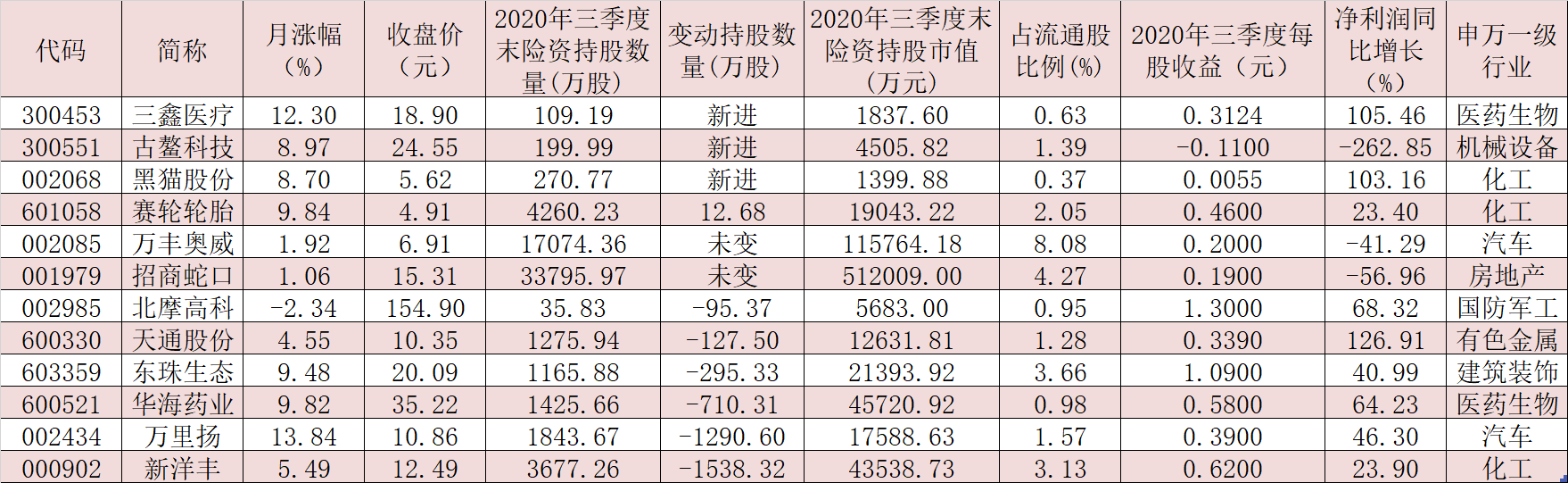 良好的業(yè)績(jī)或成險(xiǎn)資持倉(cāng)的重要?jiǎng)恿ΑI鲜?2家公司中,2020年前三季度實(shí)現(xiàn)凈利潤(rùn)同比增長(zhǎng)的公司有9家,占比逾七成。天通股份、三鑫醫(yī)療、黑貓股份等3家公司報(bào)告期內(nèi)凈利潤(rùn)同比增長(zhǎng)均在100%以上。