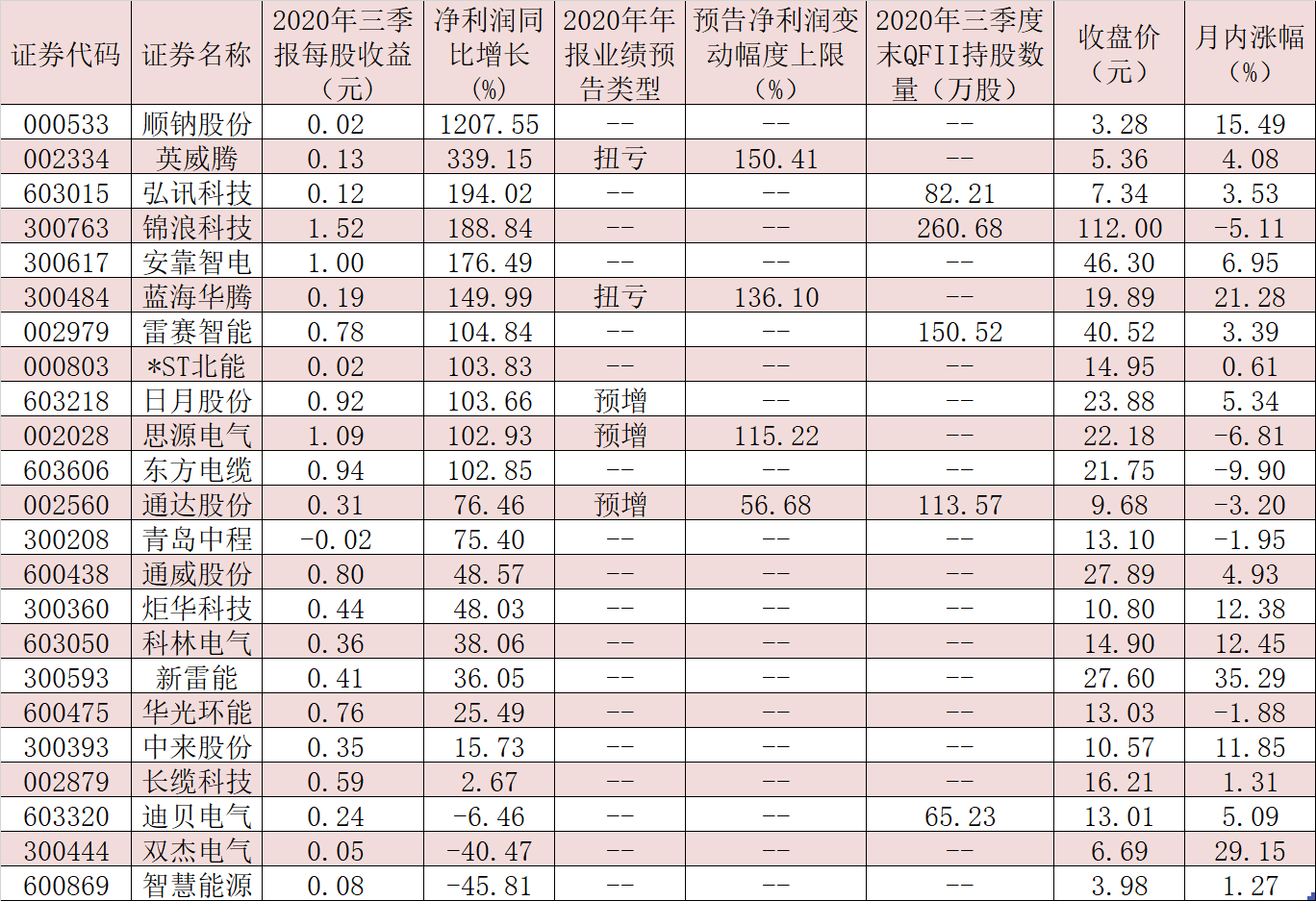 表:已披露2020年三季報業(yè)績的電氣設(shè)備公司一覽(截至10月23日)