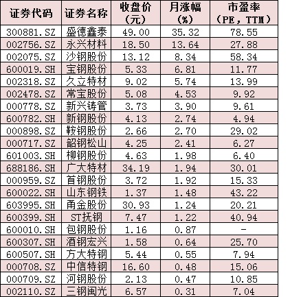 可以看到,進(jìn)入10月份以來,在大盤震蕩回落中,沉寂多日的鋼鐵股盡顯韌性,穩(wěn)步攀升。統(tǒng)計(jì)發(fā)現(xiàn),鋼鐵板塊指數(shù)月內(nèi)累計(jì)漲幅達(dá)2.29%,悄然跑贏上證指數(shù)1.86%的月漲幅。其中,盛德鑫泰、永興材料、沙鋼股份、寶鋼股份、久立特材等個(gè)股,累計(jì)月漲幅均超5%,盡顯強(qiáng)勢(shì)。