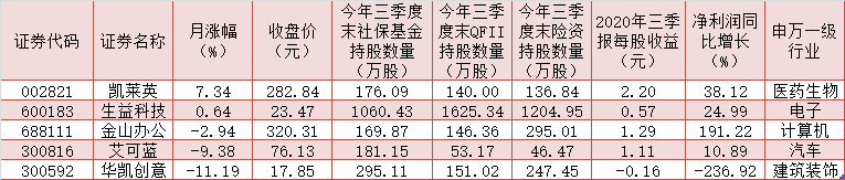 QFII方面,上述5只個股中,今年三季度QFII共計新進持有華凱創(chuàng)意、凱萊英等2只個股,最新持股數(shù)量分別為151.02萬股、140萬股。此外,還有金山辦公、生益科技等2只個股今年二季度受到QFII增持,增持數(shù)量分別為40.12萬股、26.60萬股,增持后持股數(shù)量分別為146.36萬股、1625.34萬股。