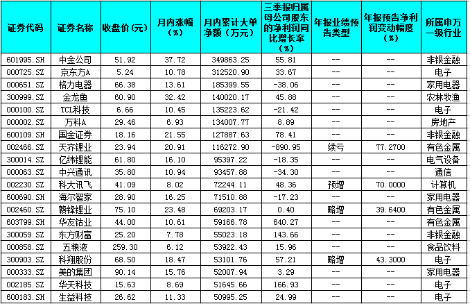 表:月內(nèi)大單資金凈流入在5億元以上個股一覽