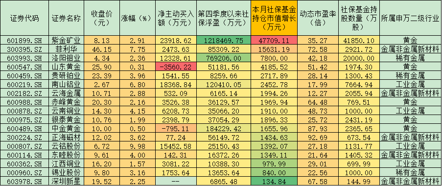 資金的流入增加了市場(chǎng)人氣也為部分長(zhǎng)線資金帶來(lái)了較高浮盈。從社?;鸪止傻母∮瘉?lái)看,假設(shè)社保基金三季度末以來(lái)截至11月9日持股數(shù)量未發(fā)生變化,其目前共持有紫金礦業(yè)、菲利華、洛陽(yáng)鉬業(yè)等17只個(gè)股,以最新收盤(pán)價(jià)計(jì)算,其持股市值較三季度末增長(zhǎng)12.10億元。如果單看11月份以來(lái)社保基金持倉(cāng)有色金屬股的市值變化情況,則有9.61億元的賬面浮盈。
