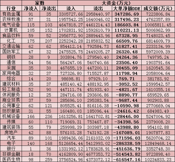 從資金層面看,今日A股大單資金整體凈流出111.15億元,其中,有1728只個股凈流入,2302只個股凈流出。從申萬一級的28個行業(yè)來看,有13個行業(yè)呈現(xiàn)大單資金凈流入態(tài)勢,其中,有色金屬和農(nóng)林牧漁等兩行業(yè)資金凈流入均超30億元,分別為34.7億元和31.75億元,合計66.45億元。緊隨其后的是電氣設(shè)備、計算機(jī)等兩行業(yè),資金凈流入均超10億元。另外,醫(yī)藥生物、非銀金融、銀行、電子等行業(yè)資金凈流出均超20億元。