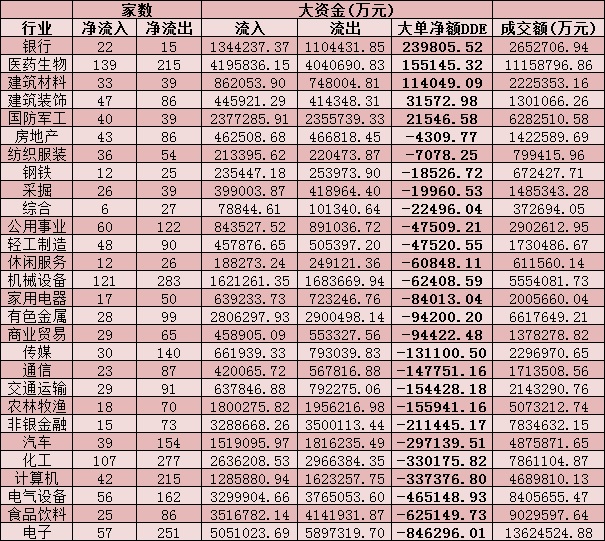 二、周三(1月6日)申萬一級(jí)行業(yè)大單資金流向