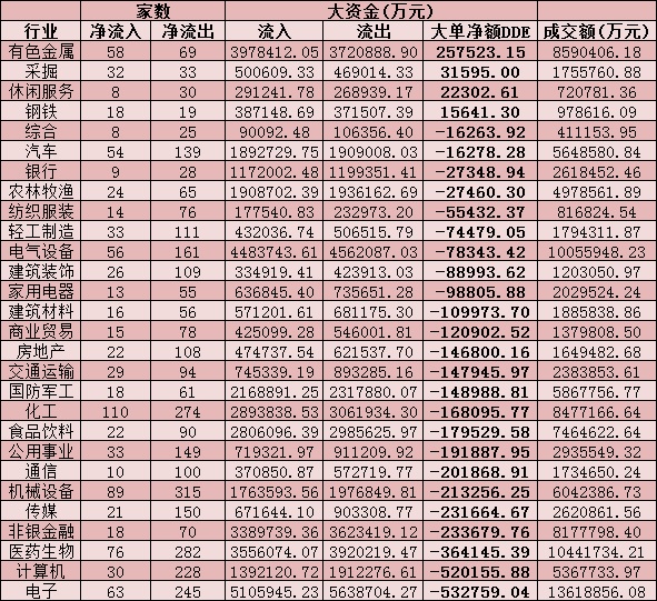 從資金層面看,今日A股大單資金整體凈流出366.7億元,其中,有891只個(gè)股呈現(xiàn)資金凈流入,3155只個(gè)股呈現(xiàn)資金凈流出。從申萬一級(jí)的28個(gè)行業(yè)來看,有4個(gè)行業(yè)呈現(xiàn)大單資金凈流入態(tài)勢(shì),其中,有色金屬行業(yè)資金凈流入居首,達(dá)25.75億元,緊隨其后的是采掘、休閑服務(wù)、鋼鐵等三行業(yè),資金呈現(xiàn)出凈流入態(tài)勢(shì),分別為3.16億元、2.23億元和1.56億元。另外,電子、計(jì)算機(jī)、醫(yī)藥生物等行業(yè)資金凈流出均超30億元。
