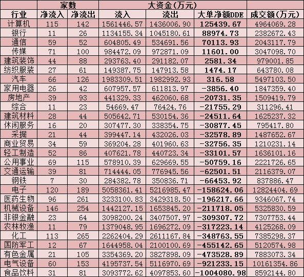 從資金層面看,今日A股大單資金整體凈流出447.36億元,其中,有1360只個股呈現(xiàn)資金凈流入,2722只個股呈現(xiàn)資金凈流出。從申萬一級的28個行業(yè)來看,有7個行業(yè)呈現(xiàn)大單資金凈流入態(tài)勢,其中,計算機(jī)、銀行、通信等三行業(yè)資金凈流入均超7億元,分別為12.54億元、8.9億元和7.01億元,合計達(dá)28.45億元,緊隨其后的是傳媒、建筑裝飾、紡織服裝、汽車等四行業(yè)。另外,食品飲料、電氣設(shè)備、有色金屬、國防軍工等行業(yè)資金凈流出均超40億元。