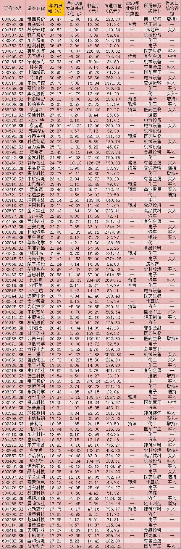 首先,擁有良好的成長性。統(tǒng)計(jì)發(fā)現(xiàn),在上述新年以來漲幅TOP100強(qiáng)勢股中,去年前三季度歸屬母公司股東的凈利潤實(shí)現(xiàn)同比增長的達(dá)到67家,占比近七成。此外,強(qiáng)勢股中已發(fā)布2020年年報(bào)業(yè)績預(yù)告的19家公司中有13家公司業(yè)績預(yù)喜,占比達(dá)68.42%。