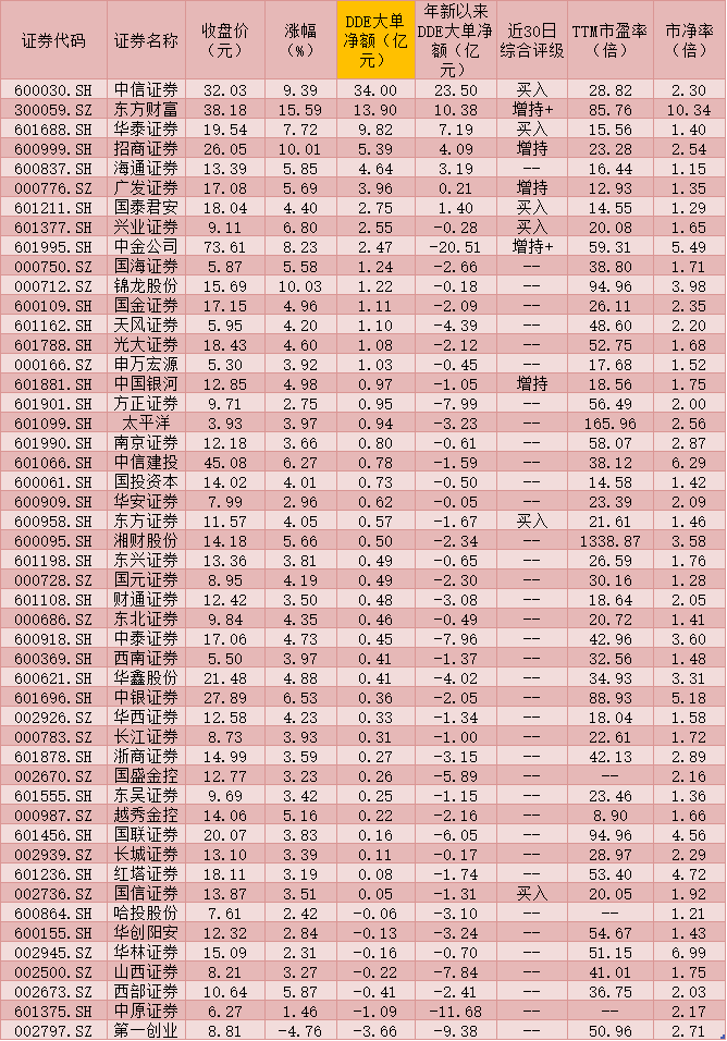 大單資金顯示出市場(chǎng)對(duì)券商股的熱情。據(jù)《證券日?qǐng)?bào)》記者通過IFIND統(tǒng)計(jì)顯示,周二券商板塊有42只個(gè)股累計(jì)呈DDE大單主動(dòng)凈流入態(tài)勢(shì),其中,中信證券(34.00億元)、東方財(cái)富(13.90億元)、華泰證券(9.82億元)、招商證券(5.39億元)、海通證券(4.64億元)、廣發(fā)證券(3.96億元)、國(guó)泰君安(2.75億元)、興業(yè)證券(2.55億元)、中金公司(2.47億元)等9只個(gè)股DDE大單凈買入額均超2億元,合計(jì)79.49億元。