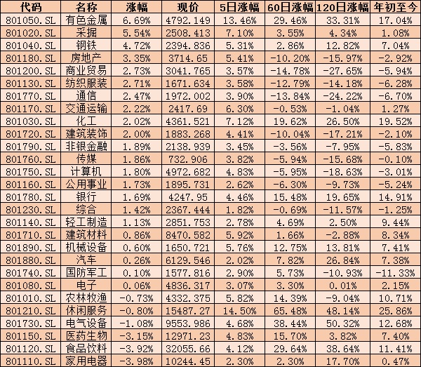 第三,資源類個(gè)股表現(xiàn)出色。從申萬一級28個(gè)行業(yè)來看,周四,有色金屬、采掘和鋼鐵等三行業(yè)漲幅居前均超4%,分別為6.69%、5.54%和4.72%。